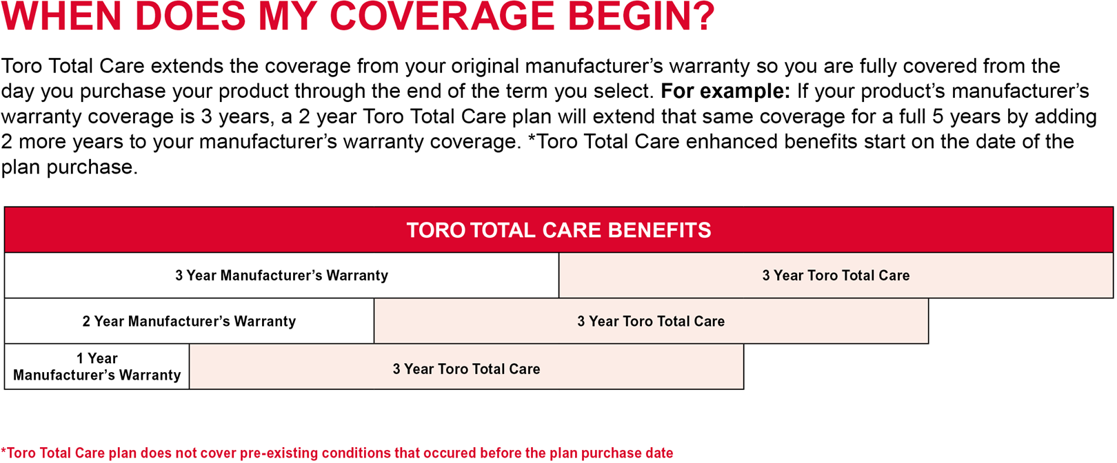 Toro Total Care coverage begins on the date of product purchase and continues for the period indicated on the purchase confirmation ("Effective Plan Dates") that is received after purchase. Toro Total Care is inclusive of the manufacturer's warranty; it does not replace the manufacturer's warranty. After the manufacturer's warranty expires Toro Total Care provides additional coverage through the Coverage Term.